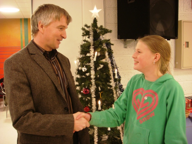 Da generalsekretær Knut S. Brinchmann hørte om Sofie og den historiske begivenheten, forlangte han straks å komme i klubben for å tildele henne nålen selv – en ære som ellers stort sett bare blir superstormestre til del. Under er overrekkelsen foreviget, og vi kan forsikre alle om at gleden var stor hos begge!