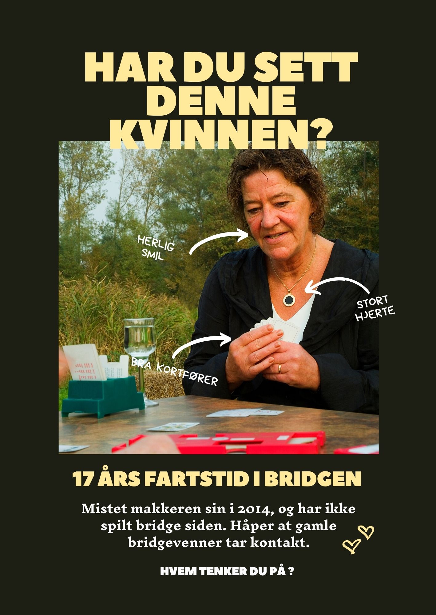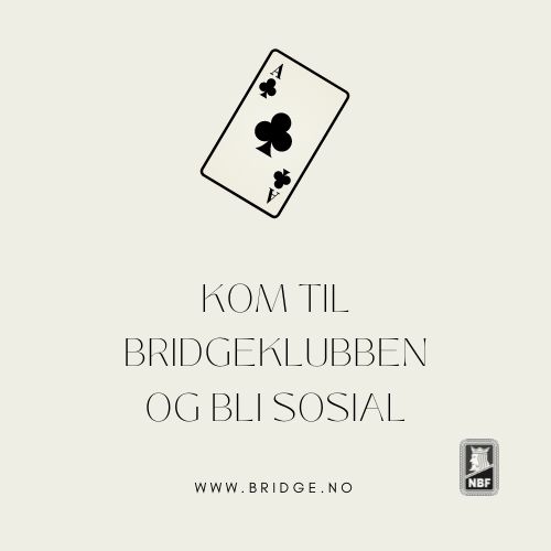 I oktober vil NBF kjøre en kampanje på facebook for å minne folk på muligheten til å ta opp bridgen igjen. Denne kan gjøres lokal, så kretser som sender inn egen tekst (og bilder?) kan få bruke disse. Gi også gjerne lenke til en egnet nettside/påmelding til lokalt arrangement/lokal facebookgruppe eller lignende slik at de som tenner på ideen vet hvor de skal henvende seg.