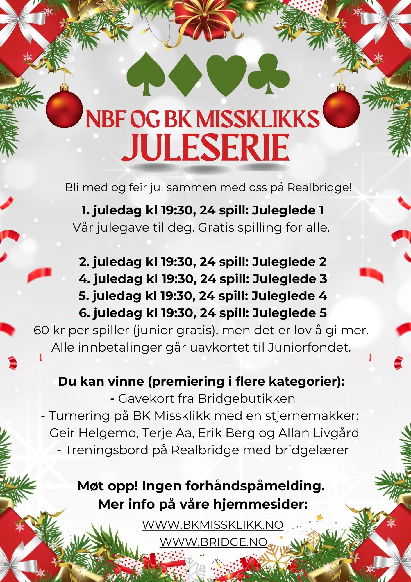 En annen tradisjon i jula er det å gi. Vi ønsker i samarbeid med BK Missklikk å gi deg en julegave i form av en online juleserie som spilles på Realbridge 1. - 6. juledag, foruten 3. juledag ettersom BK Missklikk har et annet program på lørdager. Spillingen starter kl 19:30, det er 24 spill hver kveld og du velger selv om du spiller en eller flere kvelder. Det blir gratis spilling 1. juledag, mens 2., 4., 5. og 6. juledag er spilleravgiften på 60 kr (juniorer spiller gratis). Det blir din julegave til juniorfondet og her er det lov å gi mer hvis du ønsker det. Vipps til 725570. BK Missklikk gir julegave i form av at de står for arrangementet og dets kostnader. NBF sponser serviceavgiften og premier i turneringen. Det betyr at alt som kommer inn på BK Missklikk sin Vipps-konto ifm turneringsserien går uavkortet til juniorfondet.
