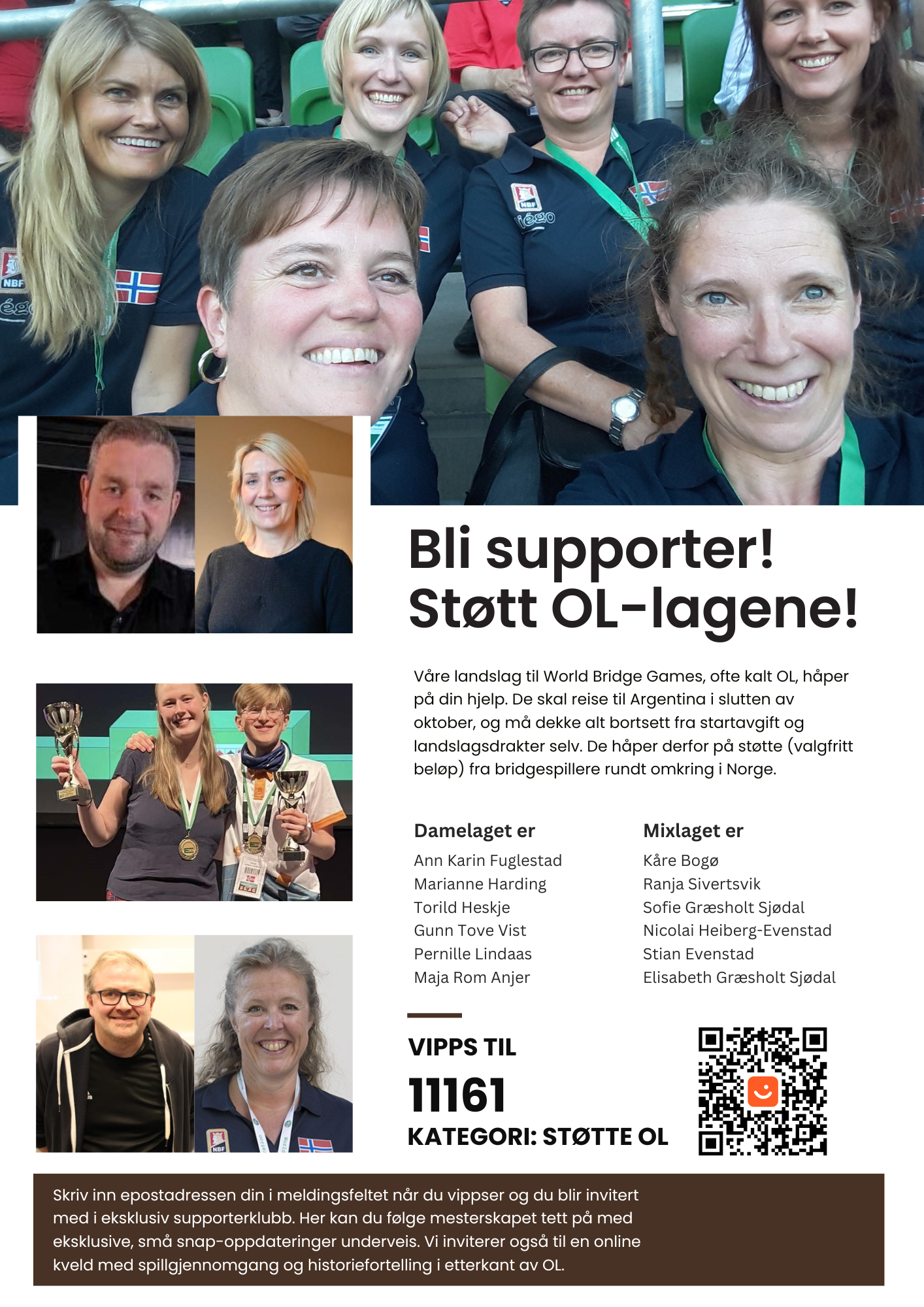 Støtten kan sendes på vipps til 11161, kategori Støtte OL. Husk å skriv inn epostadressen din når du vippser slik at vi får sendt deg invitasjon.