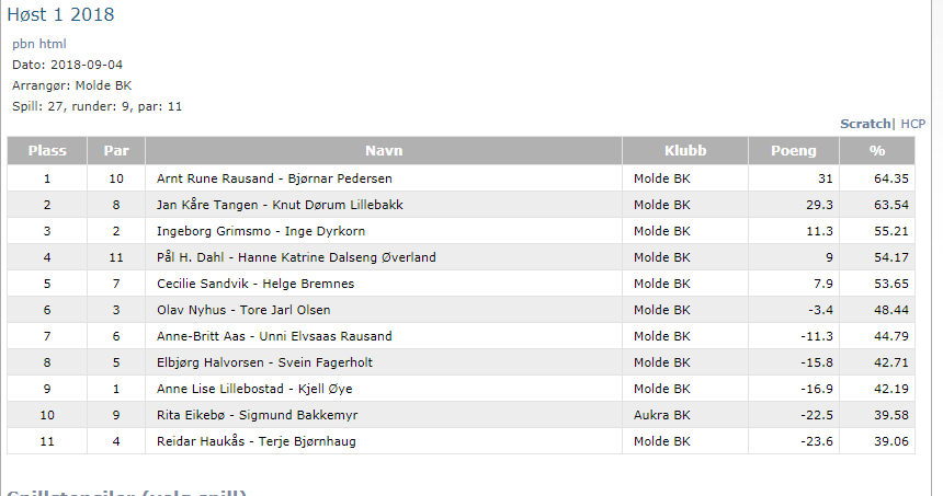 Når du går inn på resultatlista for ei hcp-turnering, vises resultatet MED hcp. Over kolonnen på resultatlista med %-skår er det nå to felter; Scratch og HCP. HCP er utheva når du kommer inn på resultatlista, noe som viser at du ser resultatet MED hcp.
