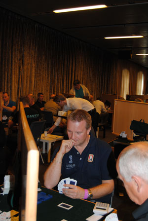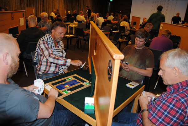 Fjorårsvinnerne: Finn Brandsnes (med kortene synlig) og makker Jo Arne Ovesen måtte denne gang ta til takke med 4. plass. Her møter de Jan Mikkelsen og Jon-Egil Furunes.
