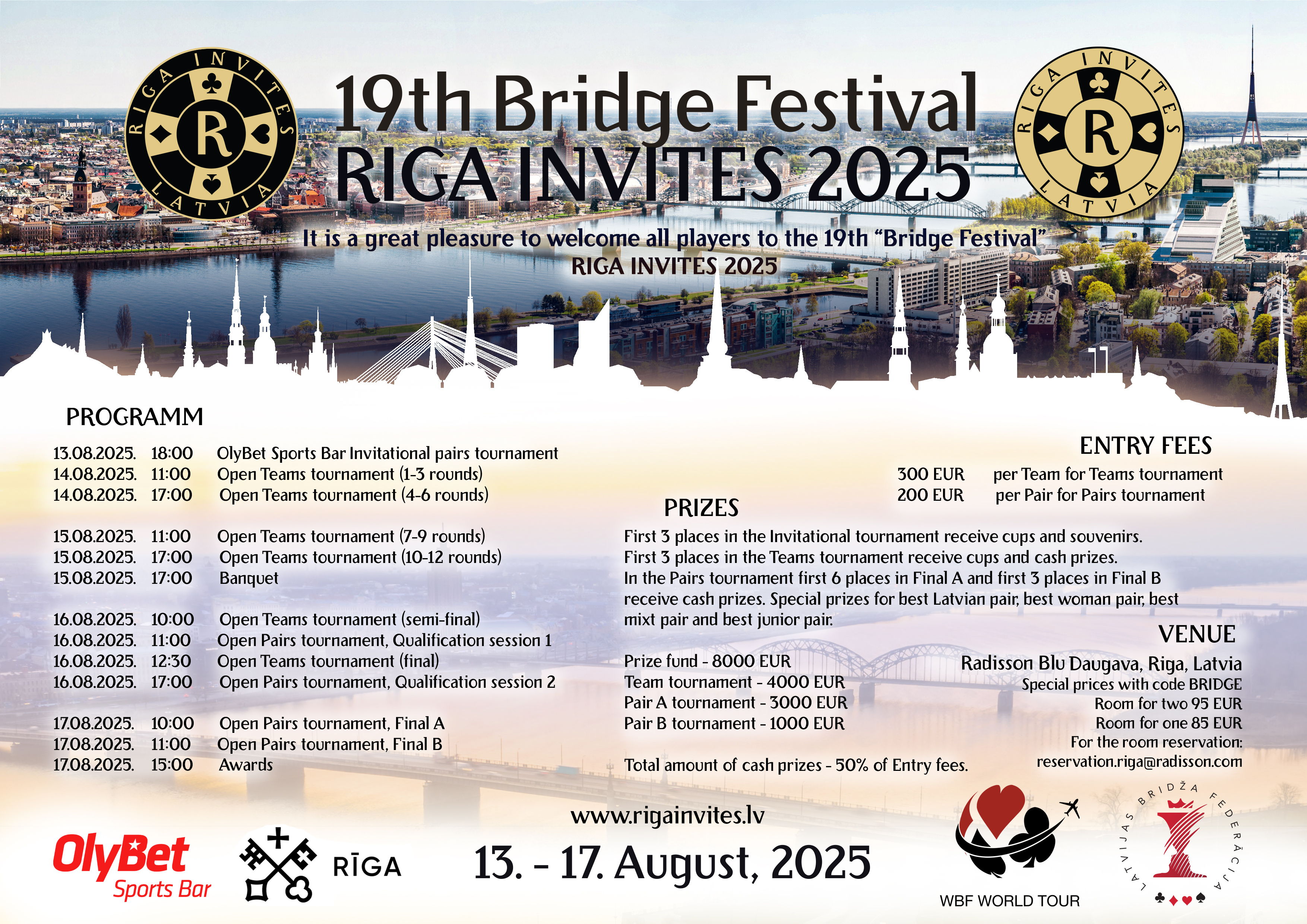 Det latviske bridgeforbundet inviterer til sin festival; Latvia Invites, i Riga 13.-17. august