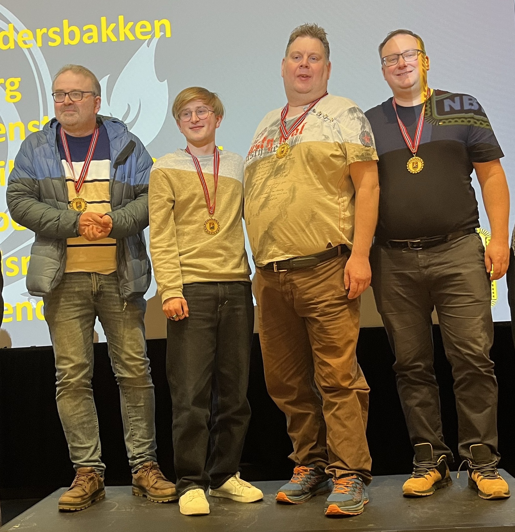 Vinnere av 1. divisjon, f.v.: Stian André Evenstad, Nicolai Heiberg-Evenstad, Ove Andersbakken og Erik Berg. Jan Petter Svendsen og Erik Sælensminde spilte ikke andre helg.