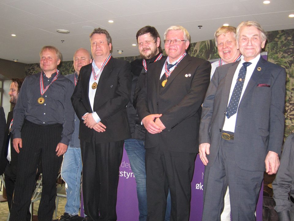 F.v Sigurd Evjen - Tormod Røren - Øyvind Saur - Erik Eide - Vidar Smith - Jon Aabye og medaljeutdeler Jon Sveindal.