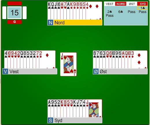 Terje satt syd i diagrammet og åpnet i 1 kløver. Vest gikk inn med 2 kølver i gunstig sone som i dette tilfellet skullet vise begge major. Til slutt kom Terje i 6 kløver (meldingsforløpet kjenner vi ikke så vi har bare satt sluttkontrakten av Nord til 6 kløver) og vest spilte ut hjerter knekt.