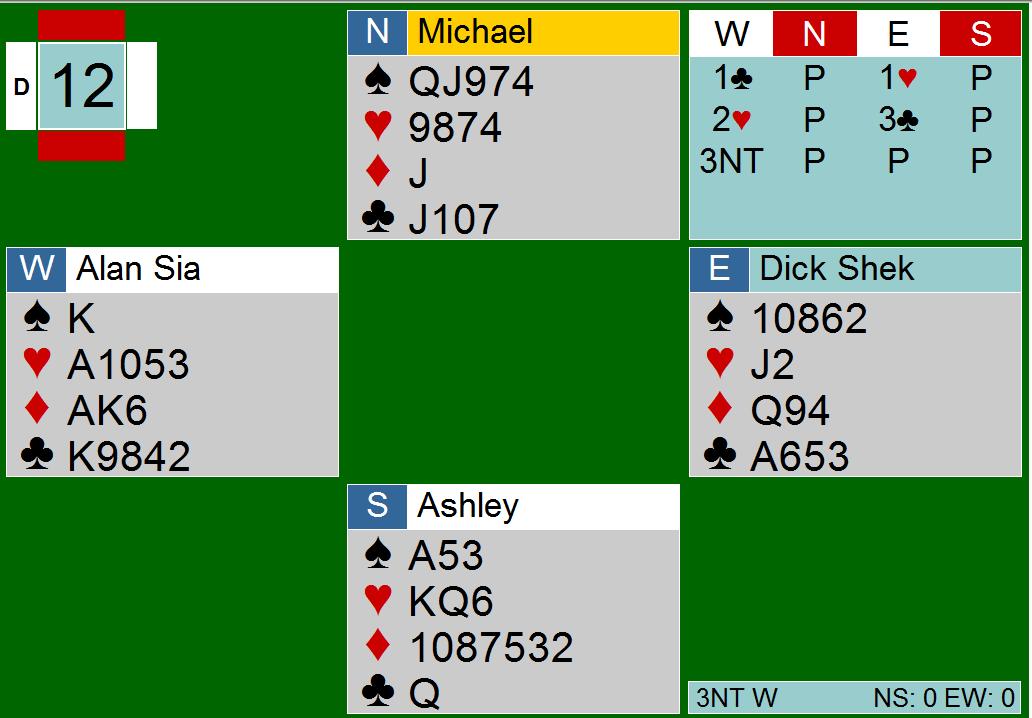 Nå vet vi det. I dag spiller han 48th Asia Pacific Bridge Federation championship for Malaysia mot New Zealand og på spillet under kom de i 3NT etter at makkeren åpnet i en kløver som ble alertert og Dick svarte 1 hjerter som sikkert viste 4 spar, hvorpå han løftet makkers 2 hjerter til 3 kløver og makkeren avsluttet med 3NT.