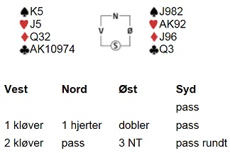 Du spiller singelmesterskap, og har for runden fått ei hyggelig dame fra Femundsenden som makker. Du sitter i øst, og havner tilslutt i 3NT etter følgende batalje: