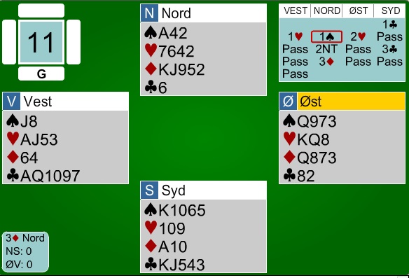 jeg burde ikke ha meldt 4 Ruter i Øst, men jeg syntes det så litt morsomt ut og tok sjansen....til makkers fortvilelse som ikke unaturlig meldte på 5 trinnet