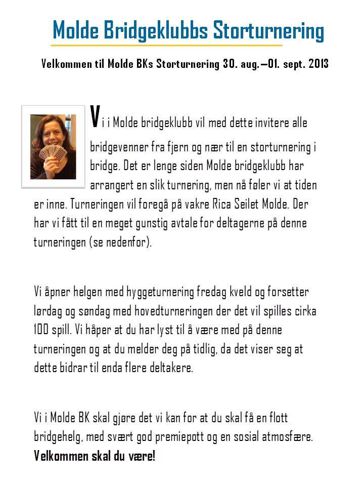 Imånadsskiftet august/september arrangerer Molde Bridgeklubb storturnering. Det er berre å merke av dagen.