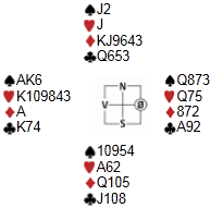 I spill 10 var det bare å kjøre trumfen til bunns som kom ekstrastikket av seg sjøl; å skvise motparten er ikke alltid det vanskeligste, mye kan skje hvis man har ei gående langfarge å trøkke med. Jeg og makker hadde havnet i 4hj på vests hånd og fikk ruterni ut: