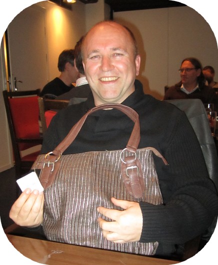 Det var loddsalg under Farsund sin Jubileumsturnering. En av de fine premiene var en lekker håndveske. Under ser du en glad og fornøyd vinner, Helge Stornes.