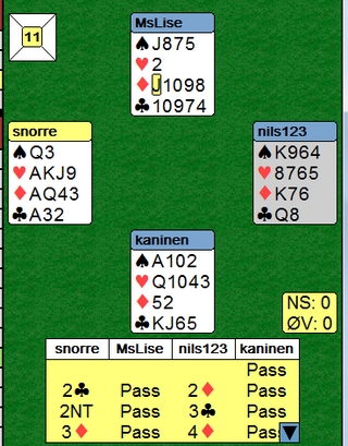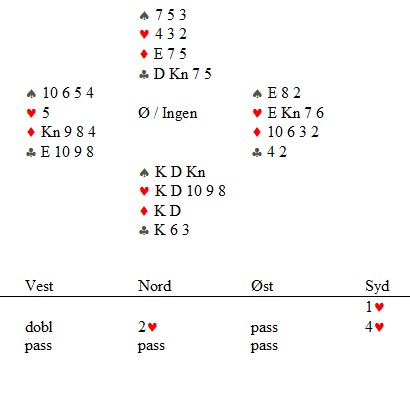 Jeg spiller 4hj uten meldinger fra motparten og får ruterknekt ut. Den stikker jeg med kongen og spiller hjerter til knekten som står. Om det er beste start, er jeg ikke sikker på, men aktuelt ble det veldig rett.