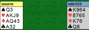 Jan Tore Berg sitter i vest og spiller ut spar til makker, Per Erik Austberg, sitt ess. Mer spar. Spillefører legger ned hjerterkonge til esset og enda en spar. Nå må spillefører komme seg inn i bordet, så han spiller ruterdame til esset og hjerter til kapp. Så en liten kløver mot bordet i denne stillingen: