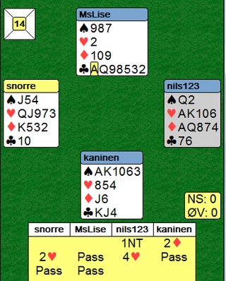 Kaninen kunne startet med EK i spar, men da hadde ikke dette spillet vært noe å skrive om. I stedet begynte han med hjerter til spillførers ess, Per Knudsen. Han tok også for hjerter kongen og spilte tre ganger ruter for å kaste en spar i bordet. Så ruter knekt og jeg ba i mitt stille sinn at kaninen ikke måtte stjele. Jeg så at han da ikke klarte å spille inn meg for å få tatt ut trumfen og hindre spillefører å stjele hjerterknekten sin.