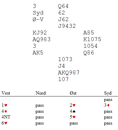Det er nok mest sannsynlig at motparten har en misforståelse her, og uansett har du god tro på bet i 2hj, så du sier pass. Ikke lenger etter er det bare å notere 6 beit for den fine scoren av 2800!