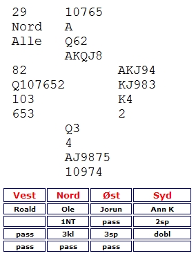 Jorun Olsen la seg i busken over 1NT, men kom tilbake med 3sp når det så ut som motparten var i ferd med å stoppe i 3kl eller 3ru. Ann Karin dobla og spilte ut sin single hjerter. Under Ole sitt ess la Jorun kongen.