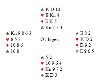 Øst åpner i 1 NT med pass rundt. Utspill Hjerter 10 til liten-liten og damen. Så  spar til tier, liten kløver til damen, liten ruter til kongen, og liten ruter fra Thor Dag som spillefører ikke klarte å legge damen på. Resultat tre beit  (!) etter en god lasj i utspill og underspilling av ruter E.