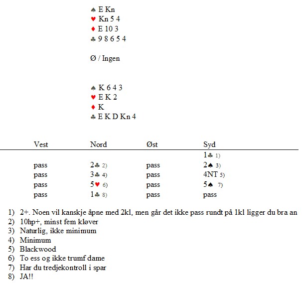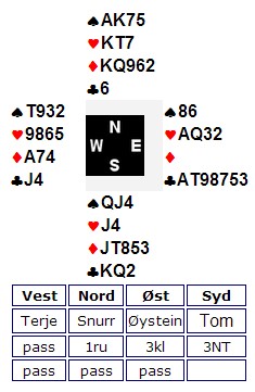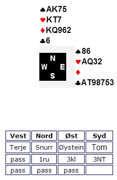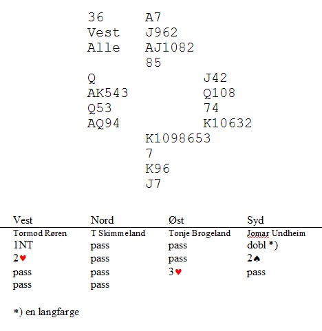 "Jeg skifter selvfølgenlig til en liten hjerter." Skal du beit dette, må makker etter all sannsynlighet ha ruter ess. Hvis så er tilfelle, haster det å sette opp tre hjerterstikk fordi spillefører har da resten av honnørene. Ruter ess, kløver ess og tre i hjerter holder akkurat til å beite. Ikke veldig sannsynlig, men husk at din 3kl satte press på syd. Han kan være undervektig i sin 3NT.