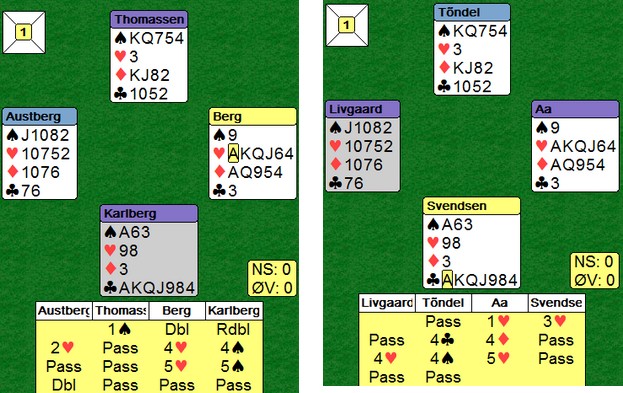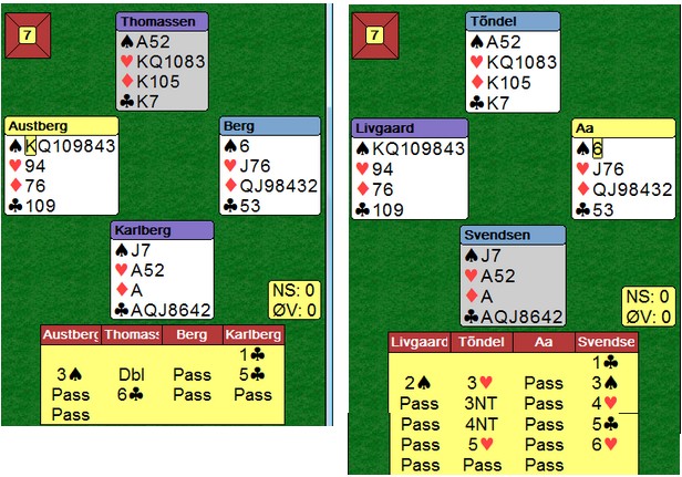 Et svært godt spill på begge bord. 6kl betes vel i praksis med hjerter ut, men på begge bord ble det ruter ut mot 6kl. Odin og Svein Gunnar stakk begge og fant vinnende plan ved å stjele en ruter i stikk to. Tre kløver fra taket ga vunnet slem.