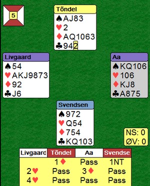 Jan Tore og PIL kom med flotte +650 fra sin kamp, men på det andre bordet meldte Terje Aa inn  2kløver med 6-5. Da kunne de ikke komme i spar lenger og måtte stampe(?) over 5ru i 6kl. Odin straffedoblet, men Petter turde ikke stå med. Han hadde kanskje tro på slem egen vei?