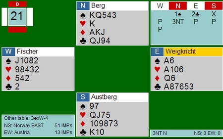 Av en eller annen grunn skifta Petter tilbake til ruter til bordets ess og nå sto det igjen ved å ta ut trumfen (med den markerte finessen). Som jeg fortalte i innledningen var ikke Syd noen toppspiller, så han så ikke muligheten for å unngå hjertertaper og la seg på et par beit. Da ble det 11 IMP til Norge, om enn noe ufortjent.