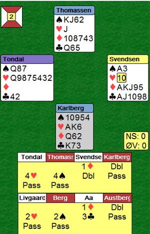 På det andre bordet havnet Ungarn NS i 4kl. En kontrakt som sto i ti stikk. 130 + 150 = 280 og 6 IMP.