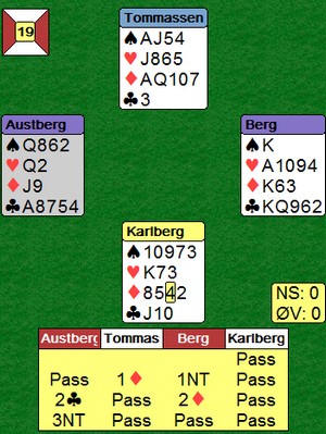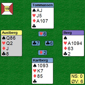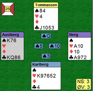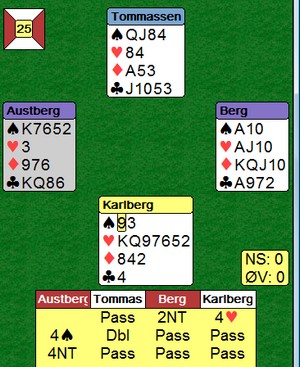 Det var mange interessante hender, hvorpå undertegnede og Ole har funnet ut at man må gjøre noen justeringer på systemet. Det er ofte man dukker opp i situasjoner som gjør ting vanskelig, disse situasjoneene burde man analysere, samt se om det er noe man kan gjøre for å ta tak i dem. Jeg har hele tiden sagt at man ikke må diskutere posser basert på hender, dvs akkurat den hånda man har forran seg osv. Det man derimot kan diskutere/justere er situasjoner som oppstår, dvs når motparten melder inn det eller det, eller når man sitter å spiller et motspill, ikke analyser det ene spillet alene, men diskuter hva de forskjellige kastene skal vise. Igjen på et generellt nivå, ikke HÅND FOR HÅND.