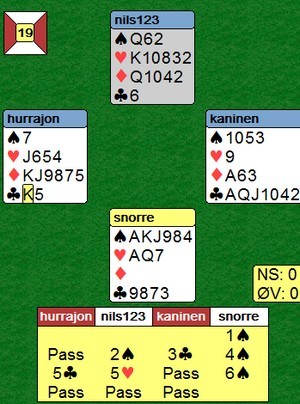 Jan Tore og PIL kom med flotte +650 fra sin kamp, men på det andre bordet meldte Terje Aa inn 2kløver med 6-5. Da kunne de ikke komme i spar lenger og måtte stampe(?) over 5ru i 6kl. Odin straffedoblet, men Petter turde ikke stå med. Han hadde kanskje tro på slem egen vei?