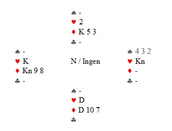 Meldingsforløpet oppe til høyre er østerrikerne sitt, mens Allan og Terje melder nede til høyre. Vest hopper over en anemisk sparfarge, men det er det da ingen grunn til? 4-4 i spar spiller nesten alltid bedre enn NT. Terje og Allan får også NT'en på rett hånd, den som har oppspillsverdier.