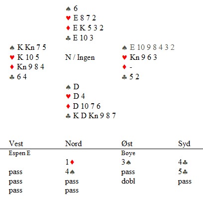Espen Erichsen spilte ut ruter 9, et unormalt høyt kort, og ba makker spille spar tilbake når han stjal utspillet. Akkurat dette skjedde. Ruter til stjeling, liten spar til kongen og nok en ruter til stjeling. De tre første stikkene til ØV og en beit.