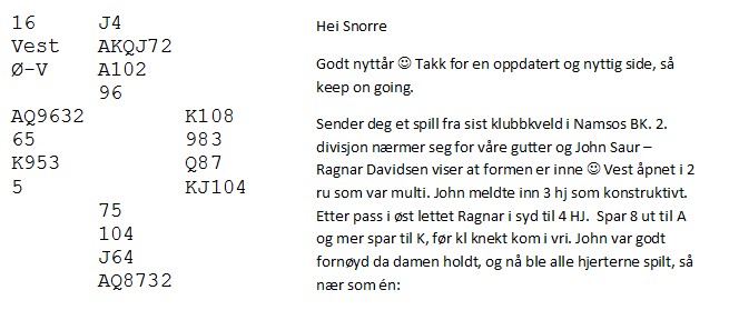 Nord-Trøndelag har variert mellom å vinne eliteserien i bridge det ene året og rykke ned det neste. I år er de i Championship, men ledelse og klar plan om å rykke opp. Knut Storeide sender meg et spill med John Saur i hovedrollen. Dere andre i samme pulja bør sjælve i buksa!!