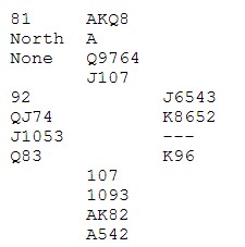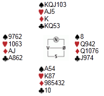 Nå satt ruteren 4-0 og det var ikke mulig å vinne slem, selv 5ru tror jeg ikke står hvis ØV holder rett. Det hadde vært et svært interessant spill om ruteren hadde sittet 2-2  Da kunne spillefører eleiminert majorfargene og løst kløveren helt sikkert med en taper ved å spille knekten. Enten seiler den til KDxxx bak og han er innspilt. Har øst en honnør, er den singel og kløver ti vil gi kontrakten.