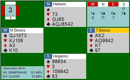 I spillet under vant Geir Helgemo 12 IMP i sin kamp. Jeg må innrømme at jeg ikke ville vært i nærheten av de IMP'ene om jeg hadde sittet på Geir sin plass. Hva med deg?