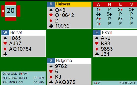 men det hjalp ikke mot Geir Helgemo. Til venstre ser du hvorfor. Vest dekket selvsagt ikke, men tieren seilte rundt. Hadde øst vært utstyrt med DJ blokk og vest 964 opprinnelig, ville dette vært et prisspill for ØV.