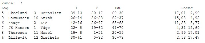Skoglund fortsetter kjøret og moser Lillevik. Lie tar inn 10 VP på Hauge og er på dette tidspunktet bare 11 bak seier. Våge ser fortapt ut, men det laget har stått opp fra de døde tidligere.