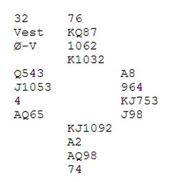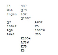 Her er et fint motspill fra KM-finalen i helga. Hjerter 4 ut gikk til kongen og esset. Kløver kongen stod rundt, og ny kløver gikk til min knekt. Jeg burde kanskje vridd ruter men fortsatte med hj 5 til 6, 9 og Q. Spar 7 gikk så rundt til Vidar`s knekt som fridde seg med ruter Q (!) til 2, 7 og K.