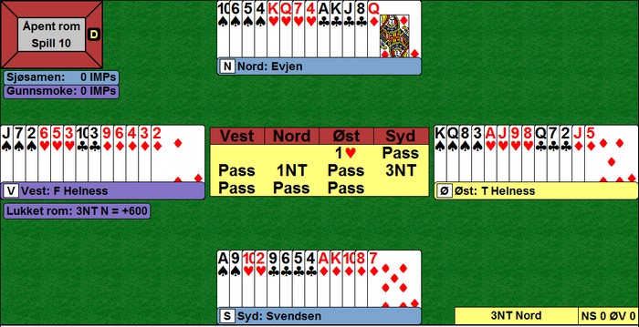 Ronny følte han hadde gode kort for sin naturlige innmelding og løfta til slem Spar konge i utspill var ikke akkurat det verste. Martin stakk, la ned kløverkongen som han fikk for, hjerter til esset, ruter til esset, hjerter konge for å kaste en ruter, ruter til kongen og ruter til stjeling. Kløverdame og claim.