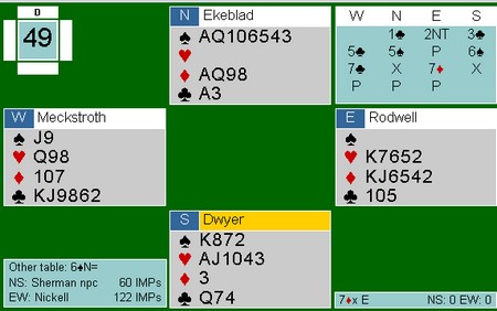 Meckstroth - Rodwell hadde ikke avtalen på plass og da kosta det 2000 i åtte hvite beiter i 7ru.  980 i 6sp på det andre bordet var en fin kontrakt, men -14 IMP likevel