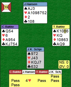 Når makker har vært i pass, synes jeg vi skal være mer "frie" i valg av åpningsmeldin, spesielt utenfor sonen. Johnny Hansen valgte 4hj og da kan jeg ikke se hvordan ØV skal komme seg på banen. To beit (skulle vel vært tre?) I det andre rommet åpnet Nord med 3hj og da doblet øst opplysende. ØV kom til 4sp og når det satt så greit som det gjorde, var det 10 stikk selv med ruter konge ut. Syd kommer aldri inn for å få hentet DJ i ruter. Tre i spar, ett i hjerter, ruter ess og fem i kløver blir ti tilsammen.