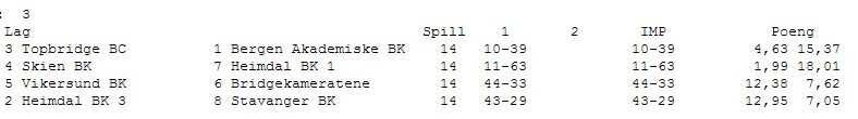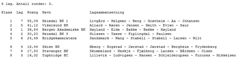 Denne gangen var det Topbridge og Bergen Akademisk som ble vist på BBO. Bergenserne ligger på middels etter to kamper, mens Topbridge har fått en tung start. BAK vant fint i første kamp, men fikk juling av Heimdal 1 i andre.