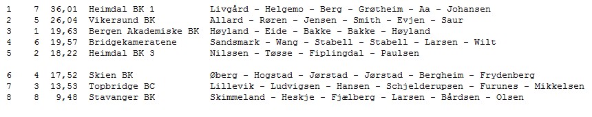 8 Tir  17:20  Østerrike  12  102    12  Purkarthofer, Fucik  Østerrike er ofte vanskelig å møte med sitt sterke kløversystem med canape. Kvangraven - Lie er kvitt startnervene og sørger for en fin seier til Norge.