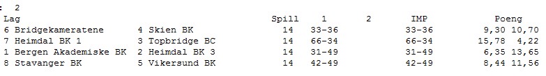2 Søn  17:20  Estland  14  31    14  Ukjente  Estland stiller også med et relativt ukjent lag hvor et par spiller naturlig og to par presisjon. Norge bygger på den gode starten og tar enda en seier.