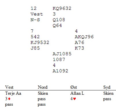 Helt til jeg spurte Terje om hvorfor motparten ikke meldte mot dem i spillet til venstre. "Æ åpna da i 3ru, sjø!!", var svaret.
