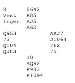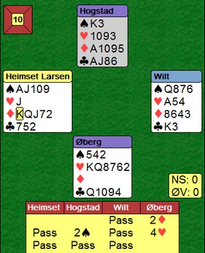 Tommy stakk med kongen og tok nok en hjerterfinesse. Det holdt, men på esset viste det seg at vest skulle ha et hjerterstikk til.