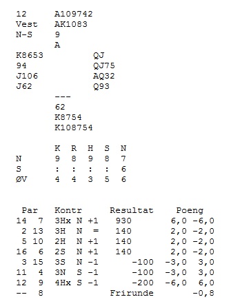 Dagens spill er ett slikt ett og er på ingen måte lett å se hvordan man skal gjennomføre. Det var Liv Bugge som gjorde meg oppmerksom på at Tor og Christian Bakke hadde sett en spilleføring av kontrakten 3 hjerter der man kunne vinne 10 stikk uten å ta for ett ess de fleste av oss ikke ville nølt med å ta for. Det hører riktignok med til historien at man også kan få 10 stikk selv om man tar for esset, men det får Christian fortelle oss om hvis han ønsker for vi tar her for oss den stilige historien der vi ikke tar for esset.