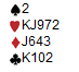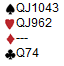 2 ruter var obligatorisk og 3 NT viste 24-25 hp. Vest mente 4 kløver som Stayman, men Øst oppfattte det som Gerber og svarte 4 NT med sine 3 ess. Vest oppfattet det som Blackwood og svarte 5 kløver ( 0 ess ). Øst trodde fortsatt på Gerber og svarte 5 NT ( 3 konger )Nå meldte Vest 6 ruter som overføring til hjerter, men Øst oppfattte det som farge og sa pass!. Med ruter knekt velvillig plassert ble det 12 sikk og kun 2 imps tap. Utrolig!