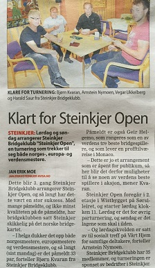 Jan P passet i åpning og Willy Kristiansen (Ø) åpner med 1 ruter, pass fra Bjørg Lystad (S) og Rolf Karlsen svarte selvsagt 1 hjerter. ØV fikk melde videre i fred, Ø gjenmeldte ruterfargen og V strakk seg til 2 spar (revers med bare 9 HP er stenhardt, men fordelingen er god). Nå måtte Ø nesten melde 2 NT, V svarte etter det 3 ruter og hadde vist ca 4-5-3-1 eller 4-5-4-0 i fordeling. Willy likte støtten i langfargen sin og avsluttet med 3 NT.