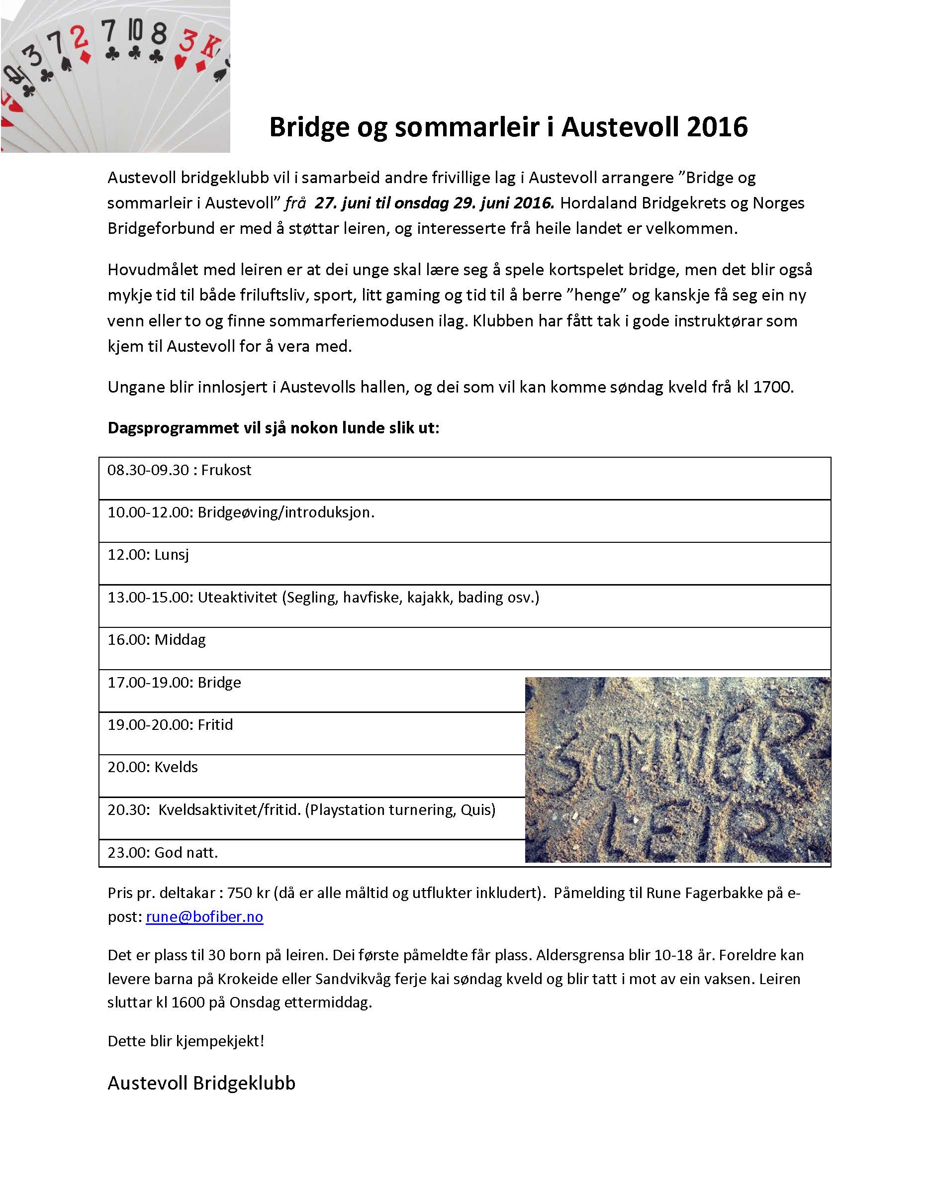 Pr. no er det kun sju ledige plassar på juniorleiren i Austevoll komande sommar. Leiren blir arrangert i tida 27. - 29. juni. I tillegg til bridge blir det ei rekke andre aktivitetar. Klubben betaler påmelding for alle juniorar frå Os som ynskjer å delta. Klikk biletet for innbyding og program.