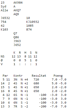 I dameklassen var åtte av 22 par i slem, fire av dem vant den. Norges damer ungikk slem, og 3NT med elleve stikk var uavgjort spill i deres kamp. I seniorklassen kom 8 par (av 24) for høyt, men også der vant halvparten av slemmelderne tolv stikk! Norges seniorer måtte tåle tapt spill da vårt Ø/V-par gikk bet i slem mens det ble spilt utgang ved det andre bordet.